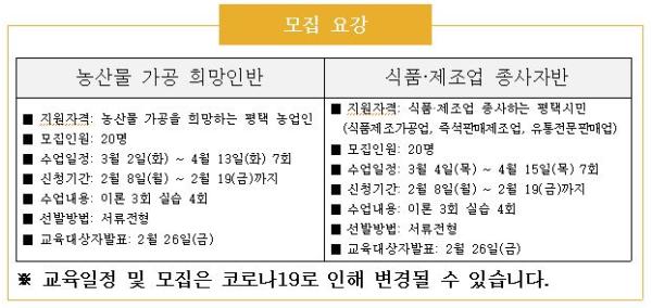 특히, 농산물가공에 필요한 기초지식과 위생, 원료배합, 가공기기 사용, 품목제조 보고서 작성 등을 배울 수 있도록 편성했다.