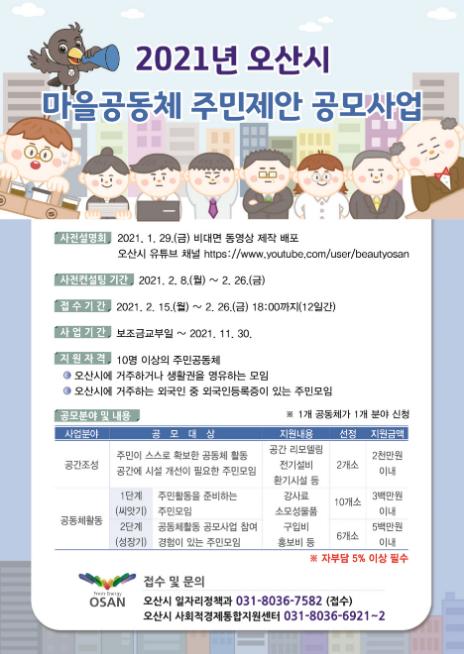 [KNT한국뉴스타임] 오산시는 시민이 안전하고 행복한 삶을 만들어가는 ‘오산시 마을공동체 주민제안 공모사업’사전설명회를 코로나19로 인하여 비대면으로 동영상을 유튜브로 배포하고 주민모임을 모집할 예정이다.