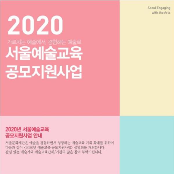 서울문화재단(대표이사 김종휘)은 시민의 예술교육 기회 확대를 위한 <2020 서울예술교육지원사업>의 공모를 오는 29일(수)부터 시작한다. 6개분야에서 창작, 교육, 체험, 워크숍 등 80여개 프로그램을 선발하며, 지원규모는 총 19억 4천 9백만원이다.