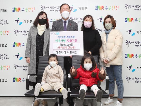 이 날 전달식에서 김성기 군수는 “어린이집 대표, 학부모와 원아가 작은 손길을 모아서 기부해주신 성금을 소중하게 사용하겠다.”고 말하며 감사의 인사를 전했다.