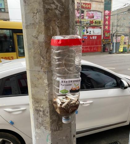 대덕 행복마을 지킴이들은 업사이클(up-cycle)의 일환으로 길에서 수거한 빈 페트병을 이용하여 구멍을 뚫고 커피찌꺼기를 넣어 담배꽁초 수집기로 재활용하였다.