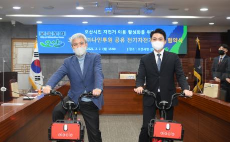 [KNT한국뉴스타임] 오산시는 지난 2일 시청 상황실에서 ㈜나인투원(대표 배지훈)과 공유 전기자전거(일레클) 운영에 대한 업무협약을 체결했다고 밝혔다.