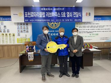 [KNT한국뉴스타임] 국제로타리 3690지구 포천로타리클럽은 지난 1일 포천시무한돌봄희망복지센터와 협력해 러브하우스 5호 열쇠 전달식을 진행했다.