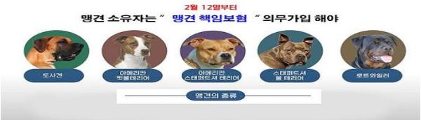 맹견으로 인한 개 물림 사고 등이 발생했을 때 사고 당사자에 대한 피해보상 체계가 미흡하다는 지적에 따라 지난해 2월 11일 「동물보호법」이 개정됐으며 오는 12일부터 맹견 소유자는 ‘맹견보험’에 의무적으로 가입해야 한다.