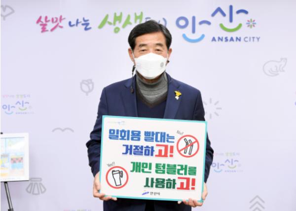 [KNT한국뉴스타임] 윤화섭 안산시장은 3일 집무실에서 최근 SNS를 통해 활발히 진행되고 있는 환경운동 ‘고고챌린지’ 캠페인에 동참하며 ‘일회용 빨대는 거절하고, 개인 텀블러를 사용하겠다’고 약속했다.