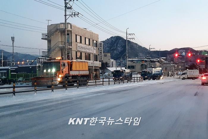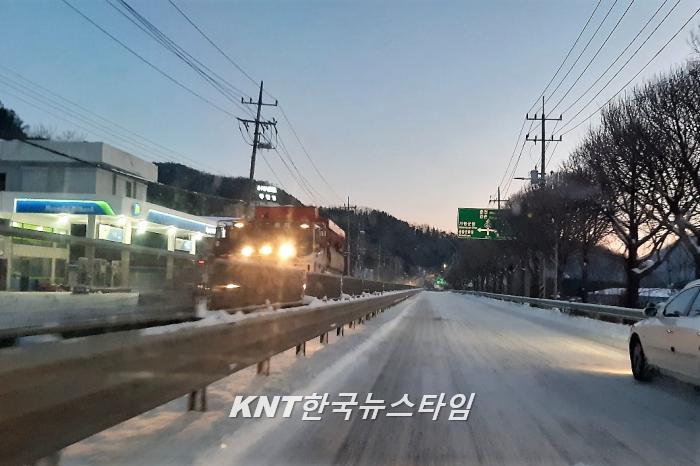 아침 07시 기준 가평군 관내 주요 도로에 제설 작업이 제때 이루어지지 않아 출근길 차량들은 거북이 운행을 하고 있으며 46번경춘국도 빛고개에는 2~3대 차량이 비상등을 켜고 정차되어 있다.