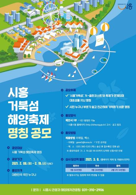 [KNT한국뉴스타임] 시흥시가 2월 8일부터 19일까지 12일간 ‘시흥거북섬 해양축제’의 명칭을 공모한다. 첫 축제의 장을 여는 만큼 시민들의 관심도를 높이고, 시흥거북섬을 널리 알리기 위해서다.