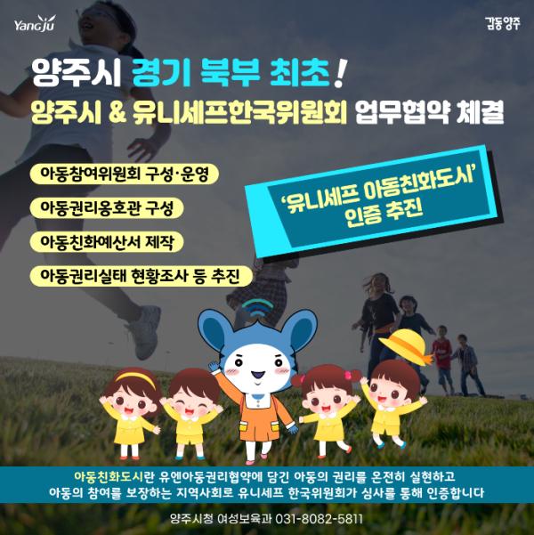 [KNT한국뉴스타임] 양주시는 지난 1일 아동친화도시 조성의 적극적 협력을 위해 [양주시↔유니세프한국위원회 업무협약]을 체결했다고 밝혔다.