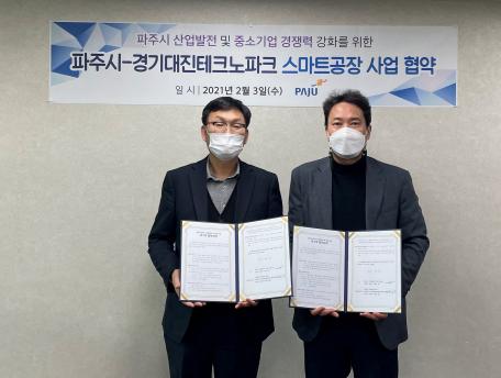 [KNT한국뉴스타임] 파주시가 지난 3일 (재)경기대진테크노파크와 지역 내 중소 제조업 경쟁력 강화와 혁신성장 지원을 위한 ‘스마트공장 구축 지원 사업’ 협약을 체결했다.