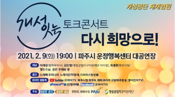 [KNT한국뉴스타임] 파주시는 오는 9일 오후 7시 운정행복센터 대공연장에서 ‘개성 잇는 토크콘서트-다시 희망으로’를 개최한다고 밝혔다.