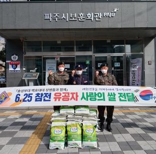 [KNT한국뉴스타임] 파주시는 지난 3일 충성부대(백호대대) 장병들이 설을 맞아 100만 원 상당의 쌀 30포를 6.25참전유공자회 파주시지회에 전달했다고 밝혔다.