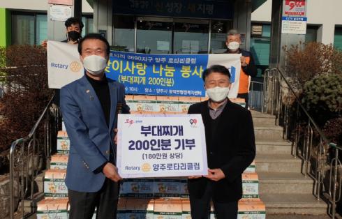 [KNT한국뉴스타임] 양주로타리클럽은 지난 3일 광적면 행정복지센터를 방문해 코로나19로 어려움을 겪고 있는 저소득층에 써달라며 부대찌개 200인분을 기부했다.