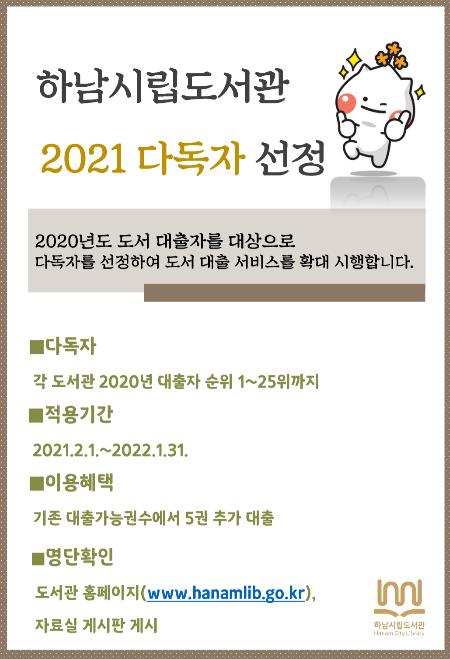 다독자는 이달부터 1년간 기존 대출가능 권수에서 5권을 더 대출받을 수 있게 된다. 선정 명단은 하남시립도서관 홈페이지에서 확인할 수 있다.