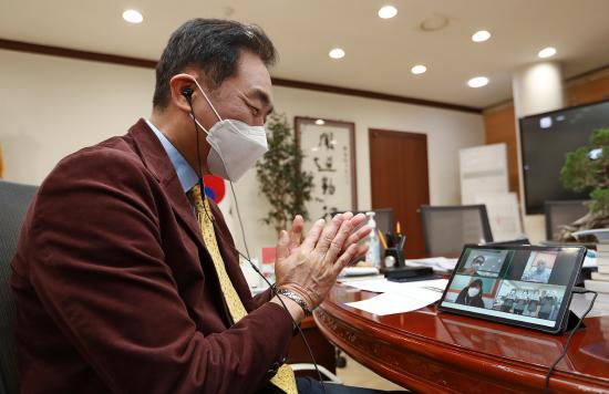 [KNT한국뉴스타임] 코로나19 3차 대유행에 따라 5인 이상 모임금지로 이번 설에도 가족 및 친지방문이 어려운 사회복지시설에 작년 추석에 이어 비대면 위문(ZOOM을 이용한 온라인 대면)을 지난 2일 평택시장 집무실에서 진행했다.