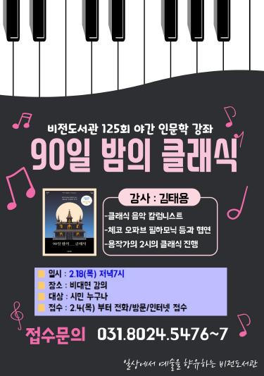 오는 18일 저녁 7시에 온라인으로 진행되는 125번째 인문학 강좌는 '90일 밤의 클래식'의 저자 김태용 작가를 초청, 특별한 이야기가 있고 누구나 공감할 수 있는 고전음악을 통해 참가자들의 상상력을 자극하는 강연으로 클래식과 친숙해지는 특별한 경험을 선사할 것으로 기대된다.