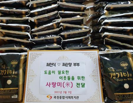 [KNT한국뉴스타임] 과천시민 최천식, 최순향 부부가 설 명절을 맞아 쌀 10kg 100포와 마스크 3,500매 등 500만 원 상당의 물품을 과천시종합사회복지관에 기부해 훈훈한 감동을 선사하고 있다.