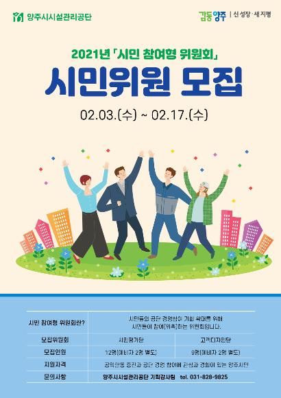 [KNT한국뉴스타임] 양주시시설관리공단은 시민 참여형 위원회에 참여할 시민위원 21명(예비자 4명 별도)을 오는 17일까지 공개 모집한다.