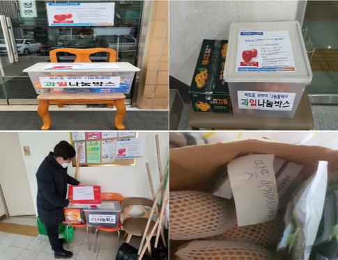 ‘1가정 1과일 나눔릴레이’는 장기적인 코로나19 및 경제악화 등의 여파로 설 명절에 과일 구입이 어려운 취약계층을 지원하기 위해 추진됐으며, 화도읍지역사회보장협의체, 동부희망케어센터와 아파트 관리사무소가 협력해 아파트 내 과일나눔박스를 설치하고 주민들이 비대면으로 자유롭게 기부하는 방식으로 진행됐다.