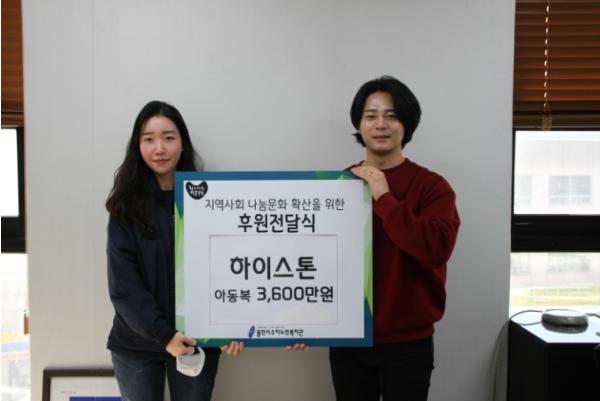 [KNT한국뉴스타임] 지구촌사회복지재단에서 운영하는 용인시수지노인복지관(관장 한근식)은 지난 4일 하이스톤(대표 하용식)과 3,600만원의 아동복 후원나눔을 진행했다.