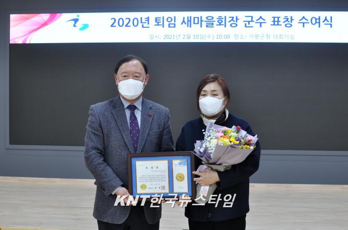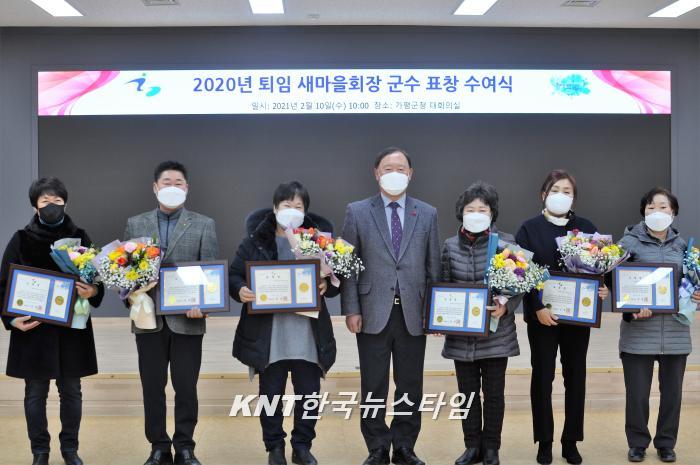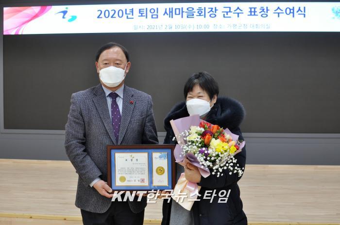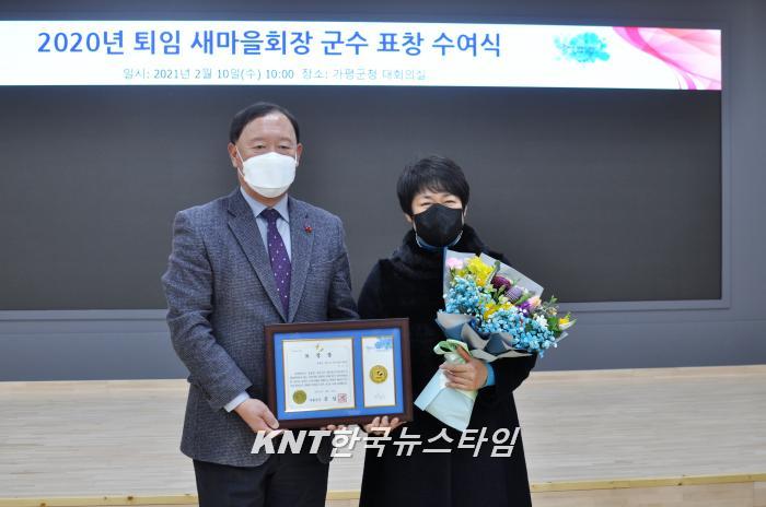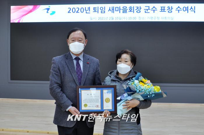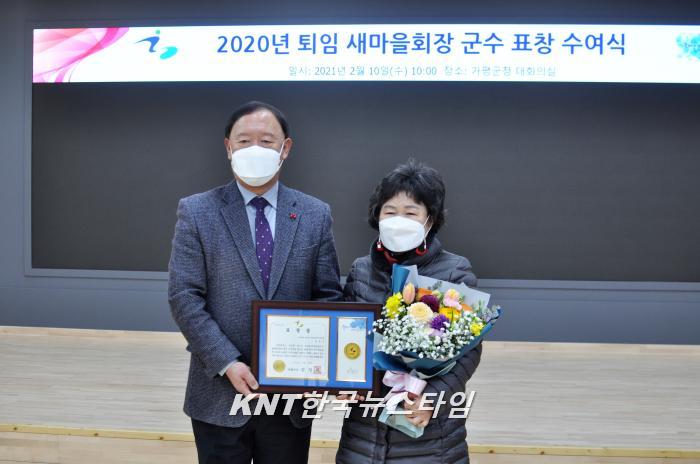 가평군 읍.면 새마을회 회장으로 재임하는 동안 지역발전을 위해 헌신봉사하고 희망과 행복이 있는 미래창조도시 실현에 기여한 공로로 표창을 실시 한 이날 표창에는 박창용 새마을지도자설악면협의회장, 김완희 가평읍내9리 부녀회장, 오옥례 설악면 천안1리 부녀회장, 김묘숙 청평면 상천1리 부녀회장, 송양분 조종면 현5리 부녀회장, 북면 적목리 부녀회장 6명이다.