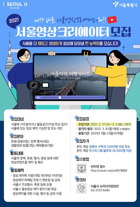 이번에 선발될 서울영상크리에이터는 3월부터 12월까지 총 10개월 동안 활동할 예정이며 제작지원비 지급 등 다양한 혜택이 주어진다.