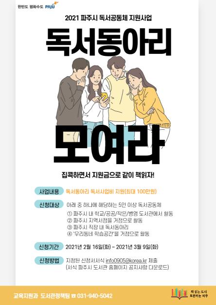 [KNT한국뉴스타임] 파주시는 2월 16일부터 3월 9일까지 2021년 파주시 독서공동체 지원사업의 지원동아리를 모집한다.