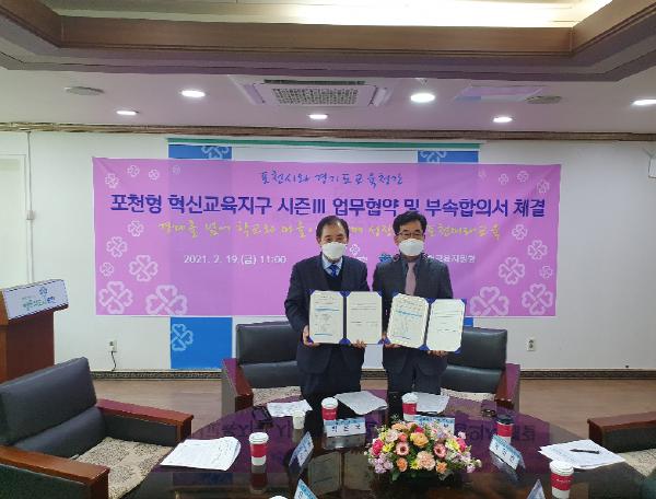 [KNT한국뉴스타임] 경기도포천교육지원청과 포천시는 2월 19일 경기도교육청과 혁신교육지구 시즌Ⅲ 운영을 위한 업무 협약을 맺고, 2021년 포천혁신교육지구 세부 사업 운영을 위한 부속합의를 체결하였다. 이 날 부속합의는 포천시청 브리핑룸에서 교육장, 시장, 시의회 의장 등 업무 관계자 10여 명이 참석한 가운데 진행되었다.