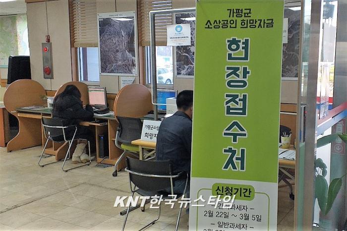 [한국뉴스타임=명기자] 22일 가평군이 코로나19의 장기화로 매출감소 등 심각한 경제적 어려움을 겪고 있는 관내 소상공인의 경영위기 극복지원을 위해 정부 재난지원금과 별도로 가평군 소상공인에게 100만원을 지급하는 “가평군 소상공인 희망자금 지원 사업” 현장 접수가 시작되었다.