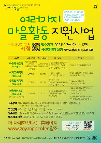 한편, 고양시자치공동체지원센터는 이번 마을공동체 활동 지원사업의 공모에 관심있는 공동체를 대상으로 마을공동체의 개념, 사업의 내용, 신청서 작성 등에 사전컨설팅도 지원해 준다. 사전컨설팅은 오는 3월 10일까지 홈페이지에서 신청 가능하다.