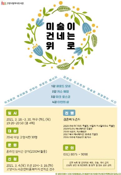 이번 ‘미술이 건네는 위로’ 강의는 줌(Zoom)을 통한 비대면 온라인 방식으로 진행되며, 수강 신청은 3월 4일 목요일 오전 10시부터 고양시도서관센터 홈페이지를 통해 할 수 있다.