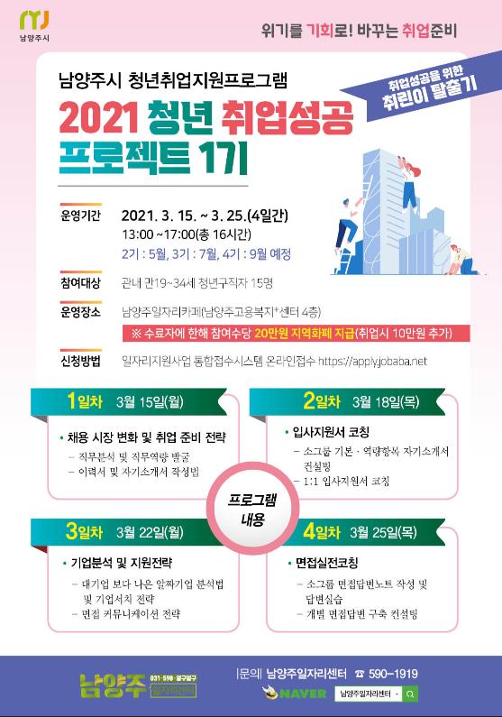 [KNT한국뉴스타임] 남양주시가 오는 3월 15일부터 25일까지 4일간 청년 취업률 향상을 위한 청년취업지원프로그램 '2021 청년 취업성공 프로젝트(1기)’를 운영한다.