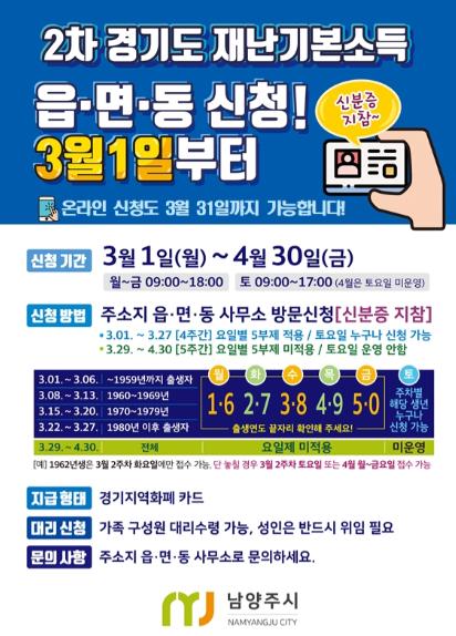 [KNT한국뉴스타임] 남양주시가 오는 3월 1일부터 주소지 읍ㆍ면ㆍ동사무소에서 ‘제2차 경기도 재난기본소득’ 현장접수를 시작한다.