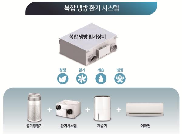 ‘복합 냉방 환기 시스템’은 냉방부터 제습, 환기, 미세먼지 제거까지 4개 기능을 한 번에 수행하는 ‘4 in 1’ 시스템이다. 실외기는 물론 에어컨, 공기청정기, 환기시스템, 제습기를 각각 설치할 필요가 없다. 청년과 신혼부부가 선호하는 소형평형에 걸 맞는 시스템이다.