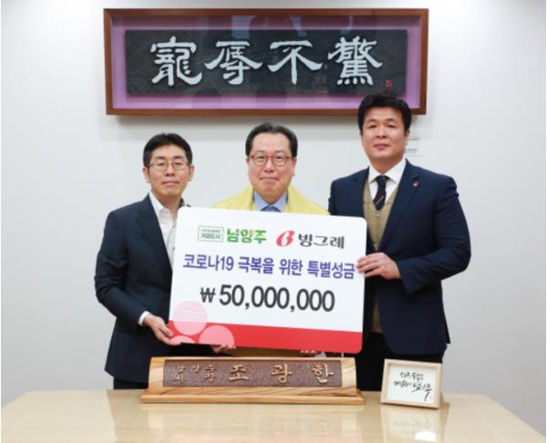 [KNT한국뉴스타임] 남양주의 대표 기업 ㈜빙그레(대표 전창원)가 11일 남양주시민의 코로나19 극복을 위한 성금 5000만원을 기탁했다.