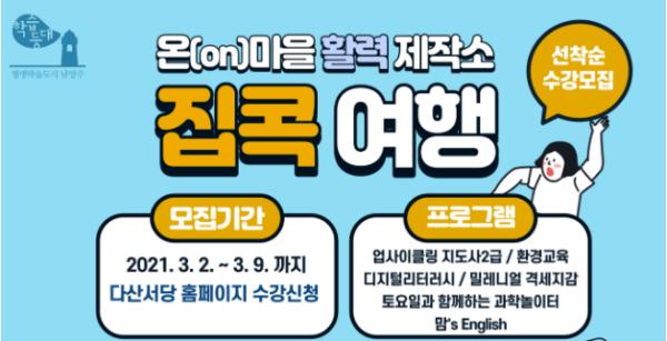 [KNT한국뉴스타임] 남양주시는 2일부터 온(ON)마을 활력제작소 ‘집콕여행’프로그램의 수강생을 모집한다고 밝혔다.