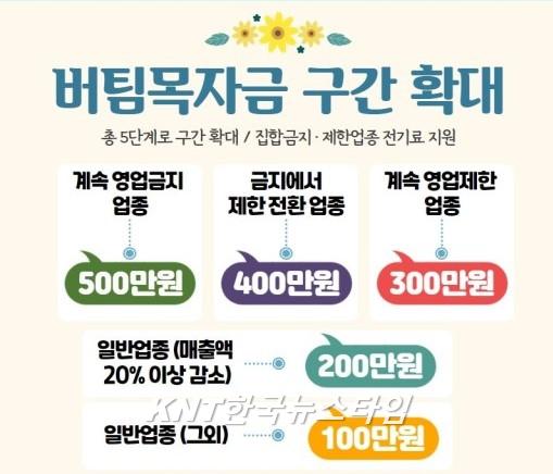 집합금지 업종의 경우 지난해 6월 이후 긴급고용안정지원금(150만원), 새희망자금(200만원), 버팀목자금(300만원)에 이어 버팀목자금 플러스(500만원)까지 합하면 총 1천150만원을 받게 된다.