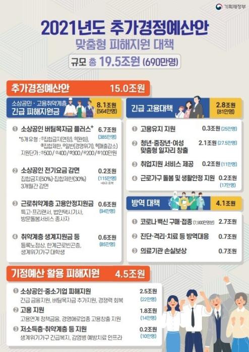 2일 정부의 추가경정예산안에 따르면 소상공인 버팀목자금 플러스 지원 대상은 3차 재난지원금인 버팀목자금(280만명) 때보다 105만 명 늘어난 385만 명이다.
