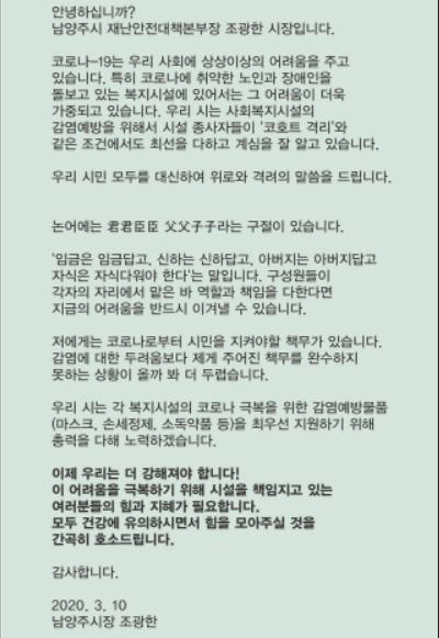 조광한 남양주시장은 코로나 예방을 위해‘동일집단격리’와 같은 조건에서 최선을 다하고 있는 시설 종사자들에게 “이 어려움을 극복하기 위해 시설을 책임지고 있는 여러분들의 힘과 지혜가 필요하며, 우리가 더 강해지기 위해 힘을 모아주실 것을 간곡히 호소드린다.”고 위로와 격려의 문자를 발송하였다.