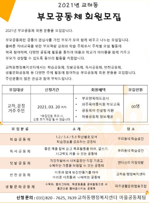 교하동에서 모집하고 있는 부모공동체는 학습공동체, 독서공동체, 텃밭공동체, 반찬공동체, 생활문화공동체로 오는 3월 20일까지 교하·운정에 거주중인 부모를 대상으로 모집한다. 공동체 활동에 관심있는 부모는 네이버 카페 ‘함께키움’을 확인하거나 교하동행정복지센터 마을공동체팀에 문의하면 된다.