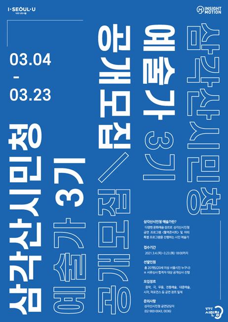 [KNT한국뉴스타임] 서울시는 3월 4일부터 23일까지 시민공연예술인들에게 폭넓은 활동 기회를 부여하고 삼각산시민청 대표 프로그램인 ‘삼각산 활력콘서트‘의 다양한 장르의 문화예술 공연을 이끌어 갈 '2021년 삼각산시민청 시민예술가’제3기 활동가를 공개 모집한다고 밝혔다.
