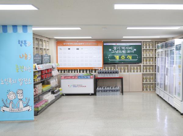 경기사회복지공동모금회 무한돌봄성금 지원으로 설치된 코너에는 햇반, 국밥, 참치, 카레 및 짜장, 김, 스팸, 라면, 마스크 등 기본 먹거리 및 생활용품 10여 가지가 마련되어 있다.