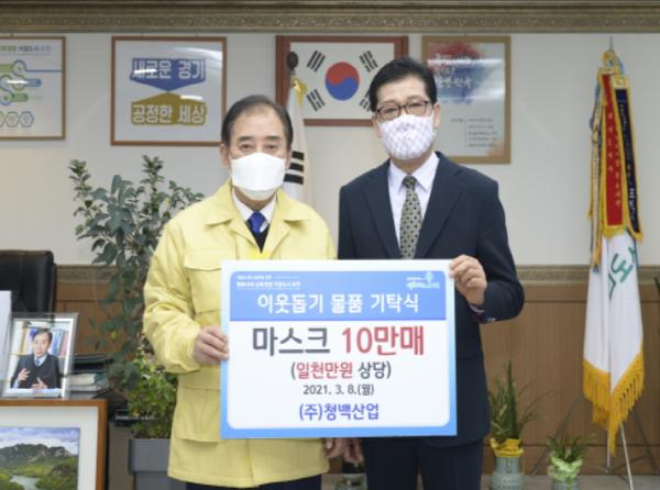 이날 마스크를 기탁한 ㈜청백산업은 소흘읍에서 의류용 트랜스를 제조하는 기업으로 제품 대금을 마스크로 대신 받아 코로나19 극복에 동참하고자 마스크를 기탁했다.