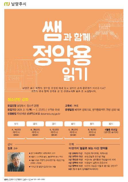 ‘쌤과 함께, 정약용 읽기’는 전문가와 함께 정약용 선생 글을 읽으면서 삶과 사상을 이해하는 시간으로 열린시민반, 청소년반, 공무원반으로 나눠서 진행되며, 위드코로나(With Corona) 방식에 맞게 비대면 강좌 5회, 유적지 현장 견학 1회로 구성됐다.