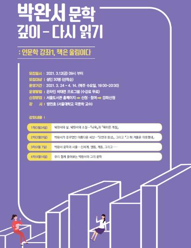 3월 24일부터 매주 수요일, 한국인이 좋아하는 소설가로 손꼽히는 박완서 작가의 작품을 깊이 있게 살펴보면서 작품 속 시공간을 탐색하는 등 매주 다른 작품과 주제로 총 4회의 강좌가 진행된다.