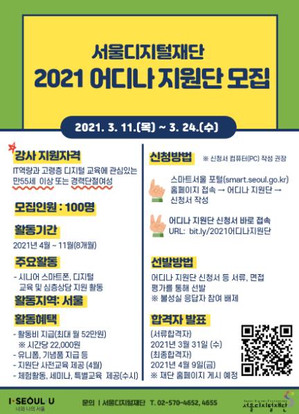 참여를 원하는 경우 오는 24일까지 ‘스마트서울 포털’을 통해 지원서를 제출하면 되며, 서류심사와 면접평가를 거쳐 최종 선발된다. 자세한 내용은 어디나 지원단 담당자에게 문의하면 된다.