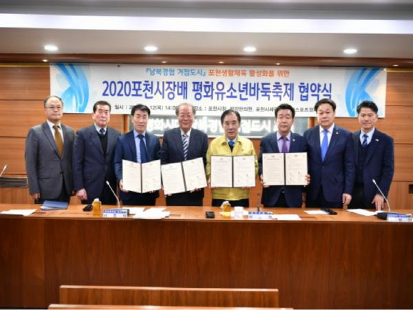 [KNT포천뉴스타임] 포천시는 편강한의원(원장 서효석), 포천시체육회(회장 김인만) 및 한스경제(대표 정순표) 등 4개 단체가 지난 12일 포천시청 시정회의실에서 ‘2020 포천시장배 평화유소년바둑축제’ 를 위한 업무협약을 체결했다.