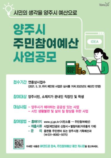 주민참여예산사업 공모는 예산편성 과정에 시민이 함께 참여해 지방재정 운영의 건전성, 투명성, 공정성을 높이기 위한 것으로 양주시에 거주하는 시민뿐만 아니라 관내 직장 또는 학교를 다니는 사람은 누구나 제안할 수 있다.
