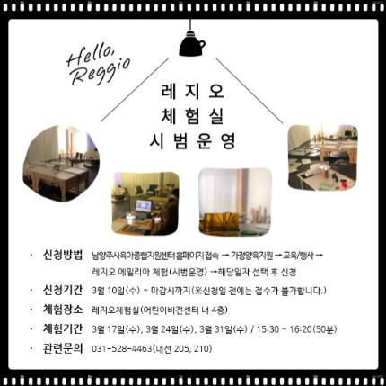 지난 시범운영에 참여한 학부모 유모씨(39)는 “최근 미디어에 노출된 영유아기 자녀의 놀이환경을 고민하던 중 레지오 교육을 접했다.”며, “남양주시에서 실시하는 레지오 체험실도 기대된다.”라고 전했다.