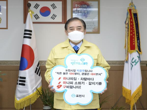 박윤국 시장은 1(하나의 집·차량마다), 1(하나의 소화기·감지기를), 9(구비합시다!)’라는 내용을 담은 사진을 홍보하고, 챌린지 다음 주자로 김성기 가평군수, 이현종 철원군수, 손세화 포천시의회의장을 지목했다.