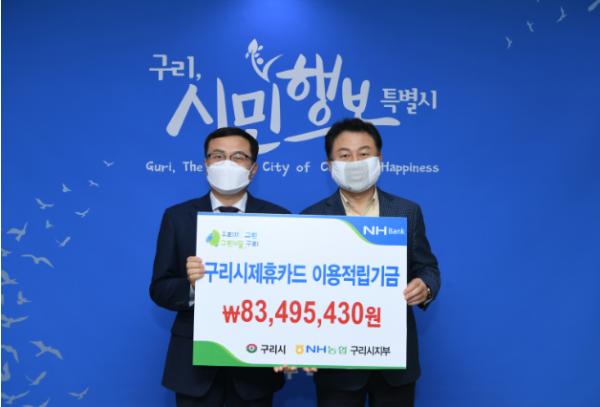 [KNT한국뉴스타임] 구리시는 15일 시청 민원상담실(3층)에서 NH농협은행 구리시지부(지부장 유재호)로부터 2020년 NH농협카드 이용에 따른 적립금 83,495,430원을 전달받았다.